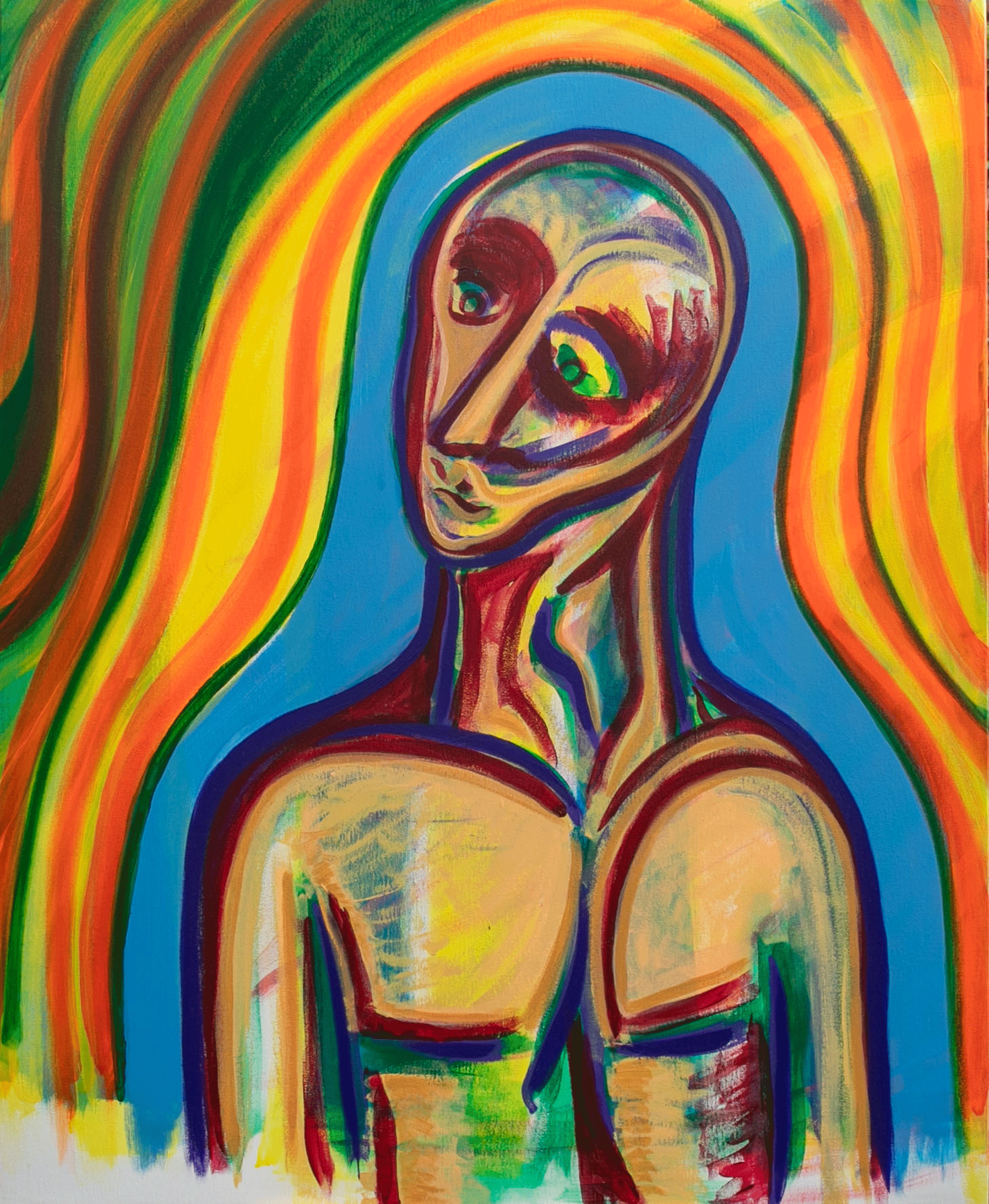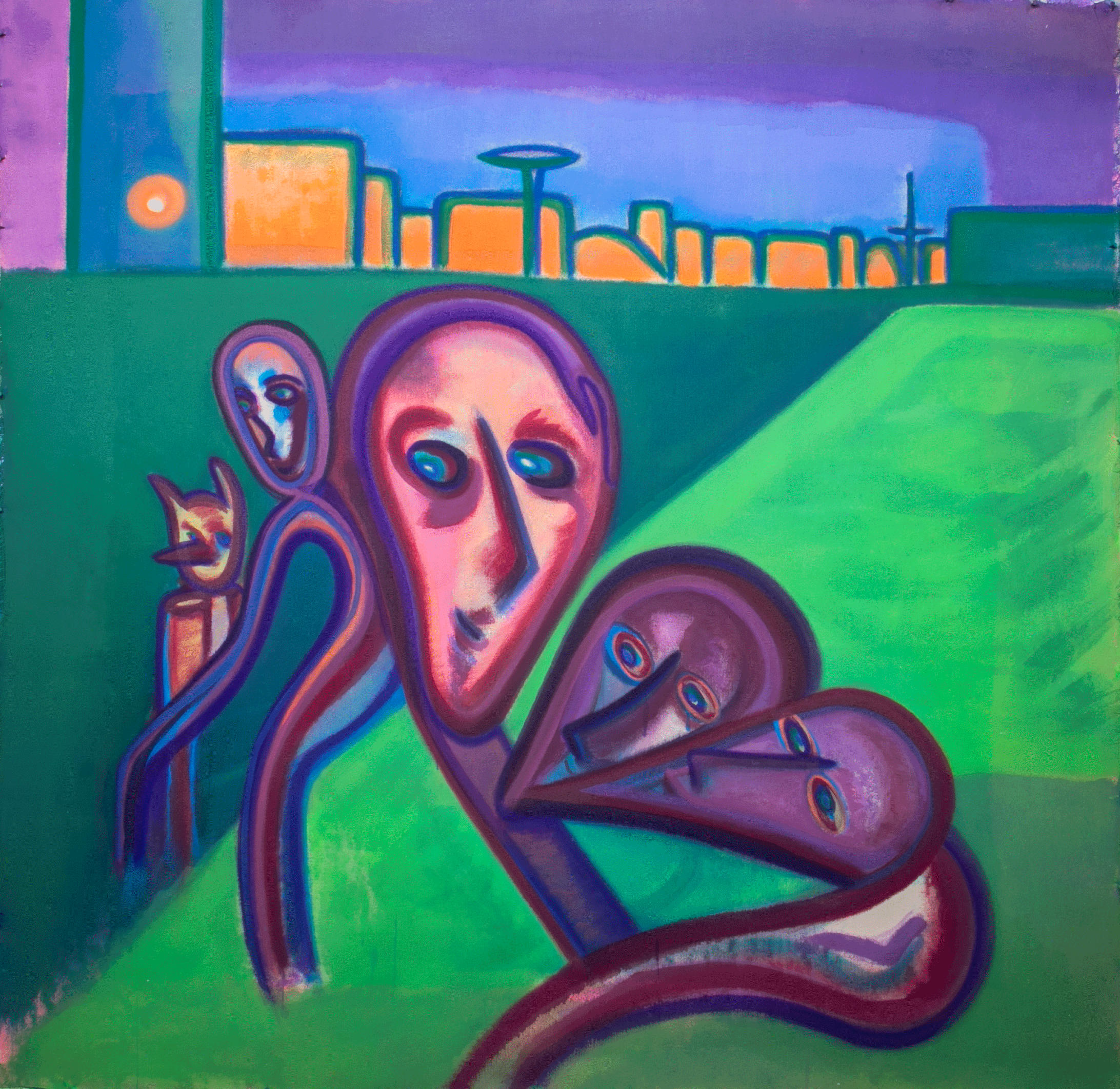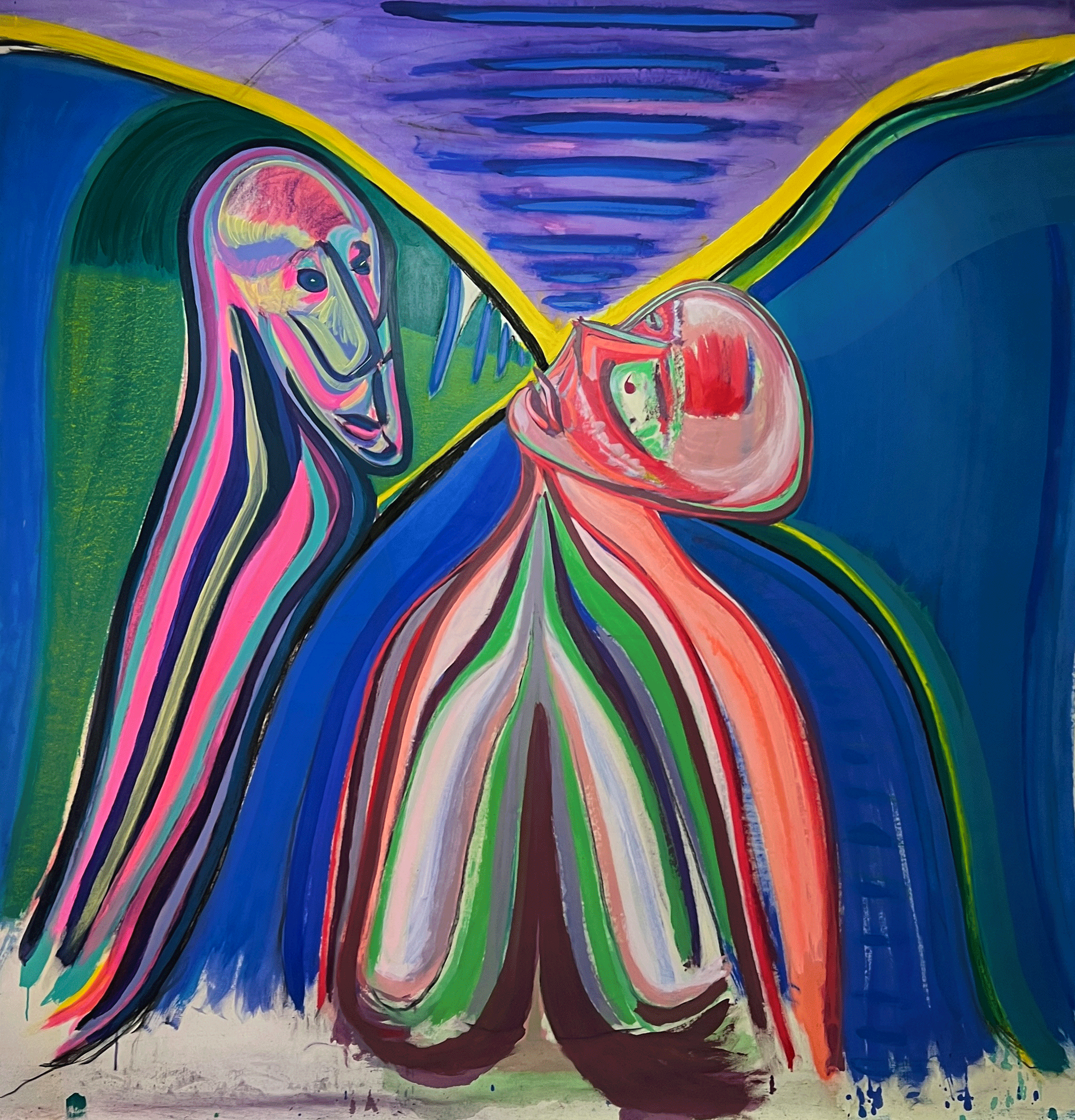 In that context, Felipe’s work becomes an energetic process to say what has not been said: during painting he acts as a medium between dimensions. “I do not know who they are, but I know I must make them exist,” he affirms. The first intuitive, decisive stroke opens a portal; from there, colour becomes figure and form, composition emerges effortlessly, and the canvases are invaded by these primal beings surrounded by auras and organic spheres evoking origin, birth, and nature. The creation of each Viscontino involves intense physical and emotional exertion—a full surrender. But it also represents a form of silent repair.