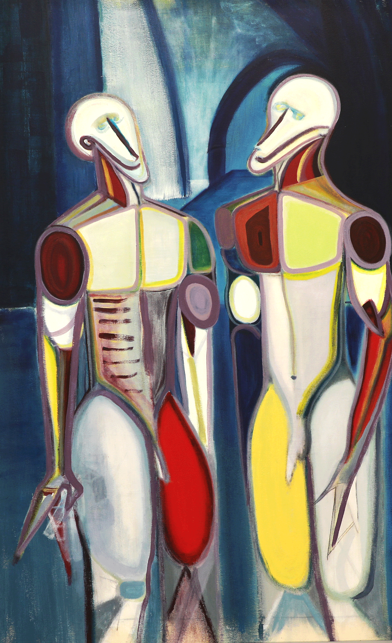 At first glance, the Viscontinos may appear as dreamlike or archetypal otherworldly figures. However, they refer to symbolic portraits of what was unsaid, what could not exist. They hold familial and collective history. They are beings without gender, without age, without hair, without clothing—stripped of anything that might place them in time or fix identity. Their constant appearance in Felipe’s work reveals a vital need: to grant them space, voice, and presence—not as decoration, but as legitimate inhabitants of a pictorial universe that calls them, finding a place on this earthly moment they once inhabited.