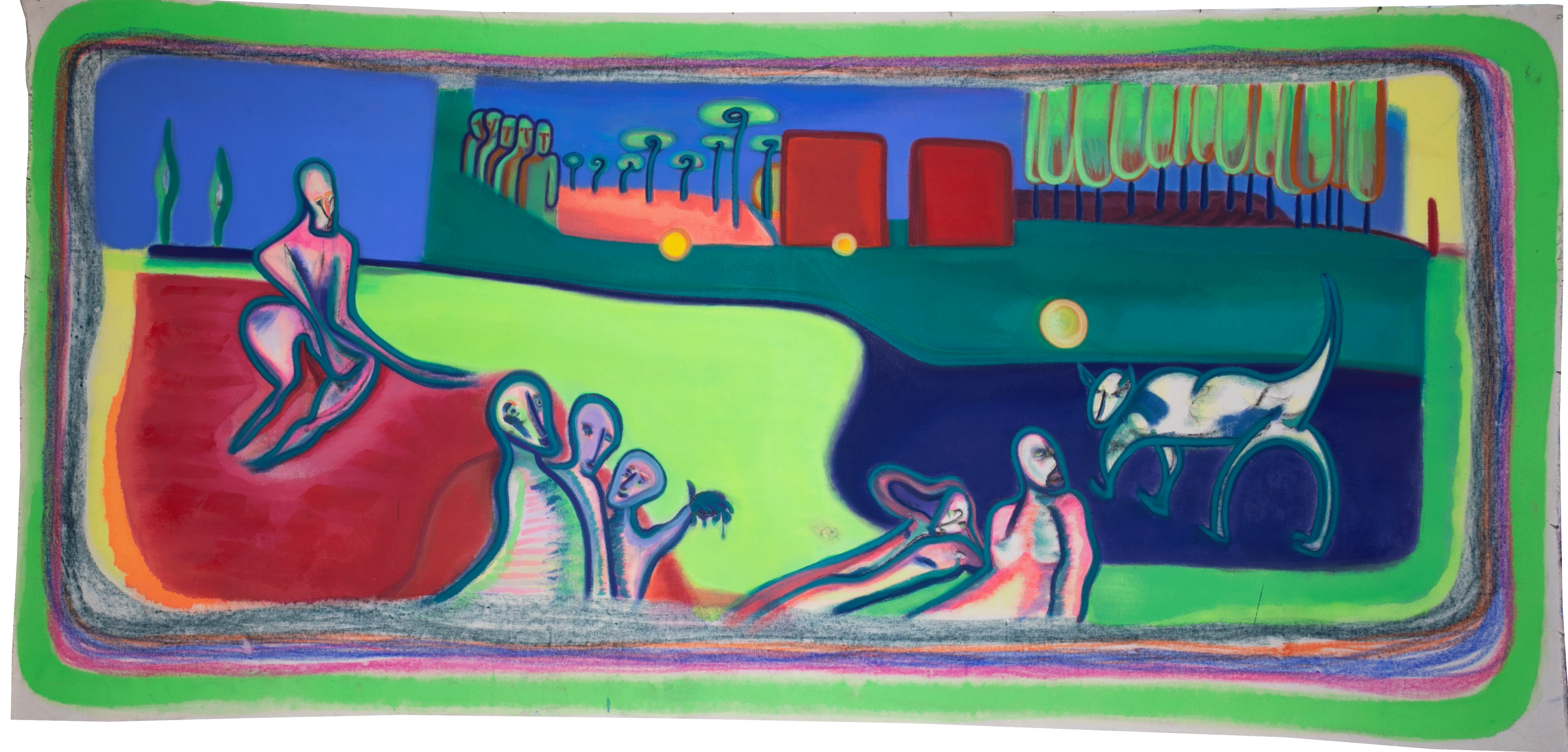 Initially they may have arisen as a way to occupy his installations—an urge to inhabit a time and place. For years, Felipe generated these characters impulsively without understanding their origin or future. However, a recent revelation radically transformed his relationship with them: a family member revealed a silenced generational story—an indigenous collective suicide among his ancestors in Santander, Colombia, possibly motivated by social judgement. This suppressed history gave new meaning to the Viscontinos. They were no longer merely enigmatic presences, but pictorial portals to an ancestral memory and a denied, fragmented truth, finally finding a way to be spoken and recognized through the artist.