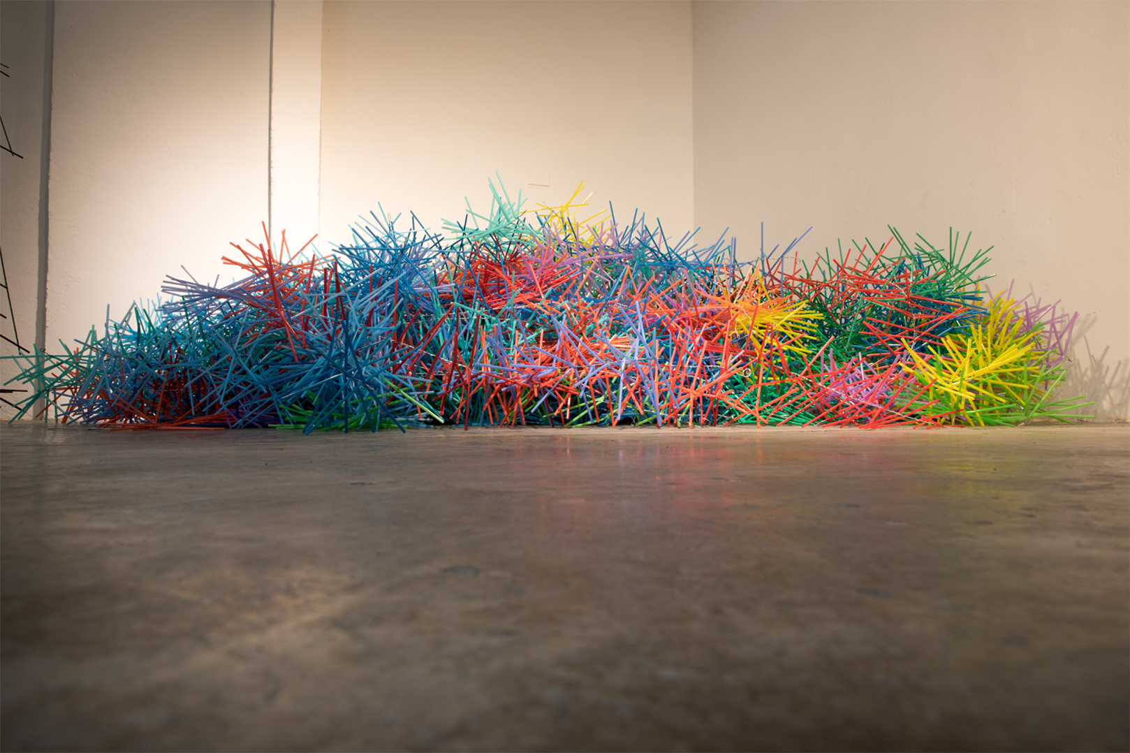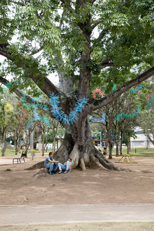 Felipe works with a palette of vivid, saturated, almost electric colours that engage in constant dialogue through contrasts and complementary harmonies: intense oranges against acidic greens, electric blues on red backgrounds, magentas that vibrate alongside dense yellows. This chromatic repetition generates internal coherence in the project, creating an authentic pictoric language.